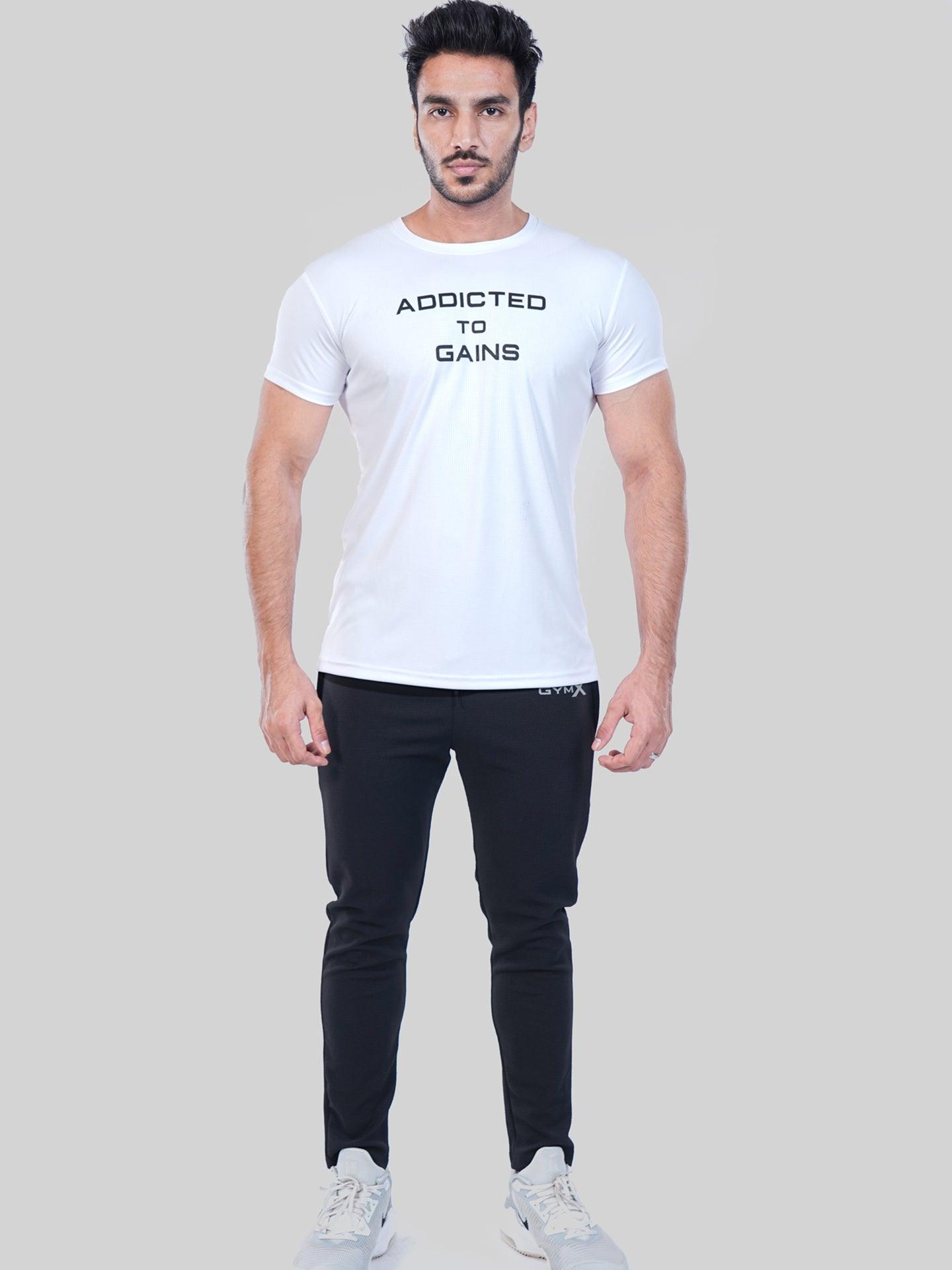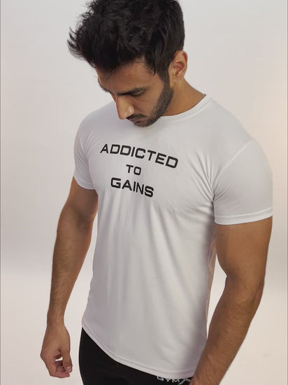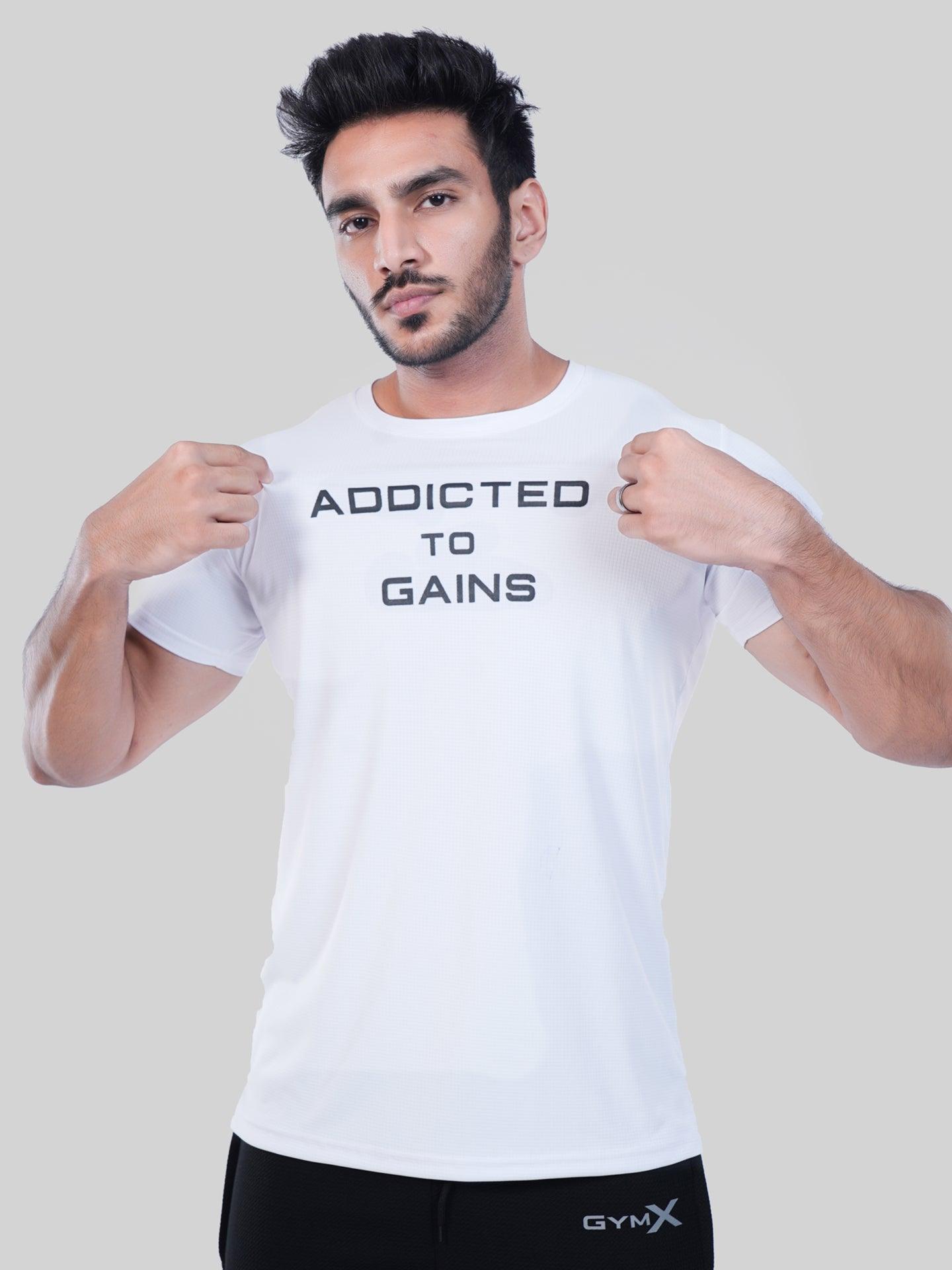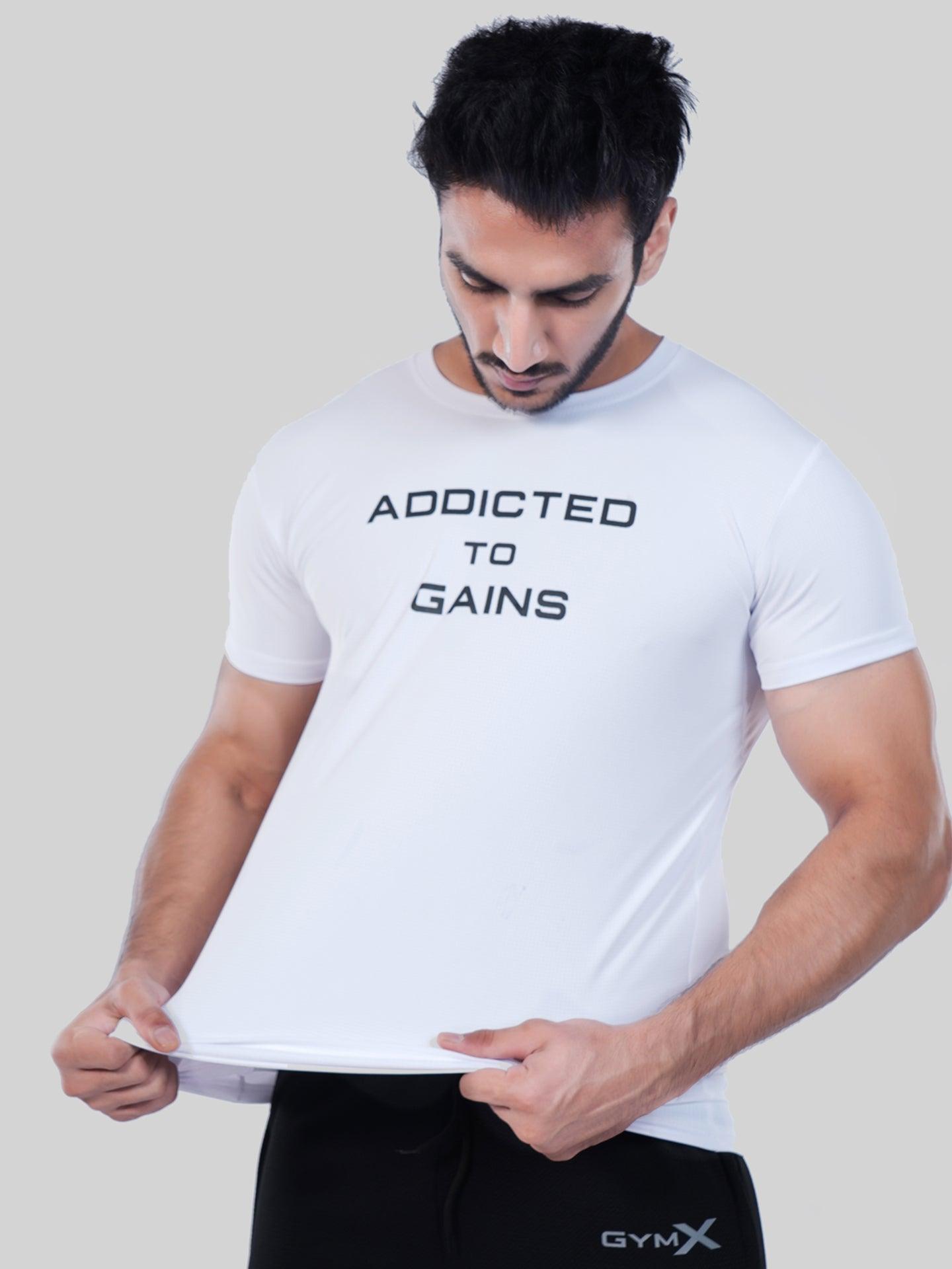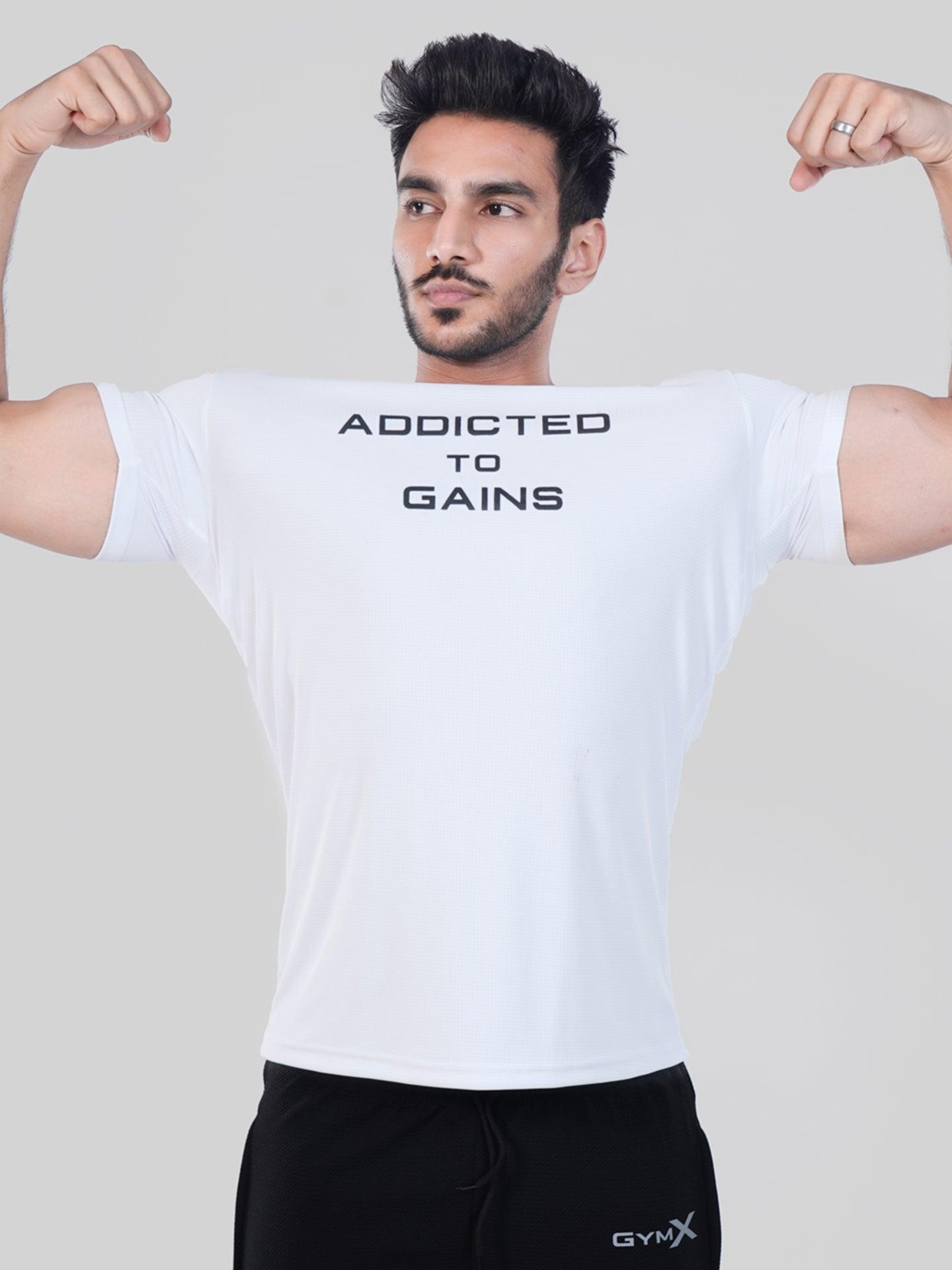 GymX Ultra Lite White Tee: Addicted To Gains - Sale